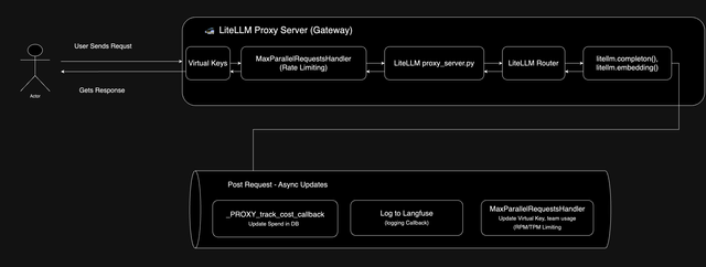 1. User Sends Request: The process begins when a user sends a request to the LiteLLM Proxy Server (Gateway).